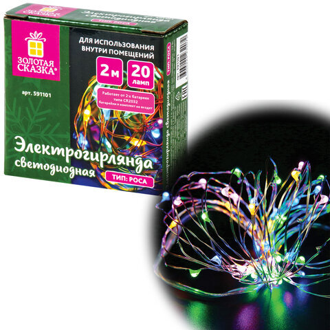 Электрогирлянда-нить комнатная "Роса" 2 м, 20 LED, мультицветная, на батарейках, ЗОЛОТАЯ СКАЗКА, 591101
