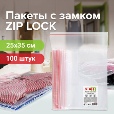 Пакеты с замком ZIP-LOCK "зиплок", комплект 100 шт., 250х350 мм, ПВД, толщина 35 мкм, STAFF, 608169