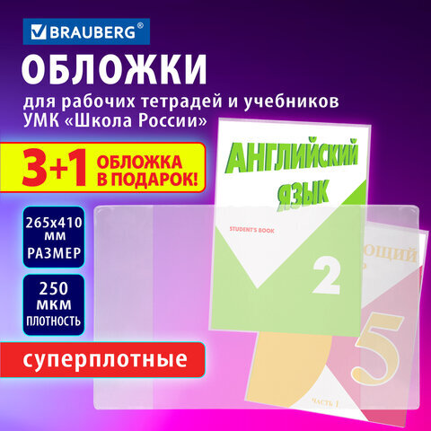 Обложки ПВХ для рабочих тетрадей и учебников, НАБОР "3 шт + 1 шт в ПОДАРОК", СУПЕРПЛОТНЫЕ, 250 мкм, 265x410 мм, прозрачные, BRAUBERG, 272694