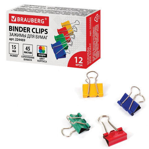 Зажимы для бумаг BRAUBERG, КОМПЛЕКТ 12 шт., 15 мм, на 45 листов, цветные, картонная коробка, 224469