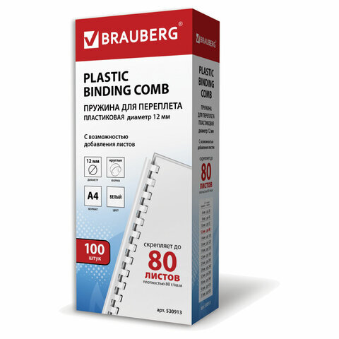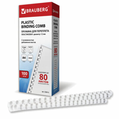 Пружины пластиковые для переплета, КОМПЛЕКТ 100 шт., 12 мм (для сшивания 56-80 л.), белые, BRAUBERG, 530913