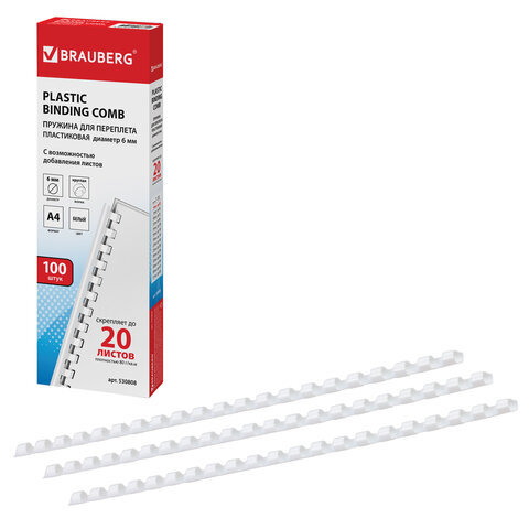 Пружины пластиковые для переплета, КОМПЛЕКТ 100 шт., 6 мм (для сшивания 10-20 л.), белые, BRAUBERG, 530808