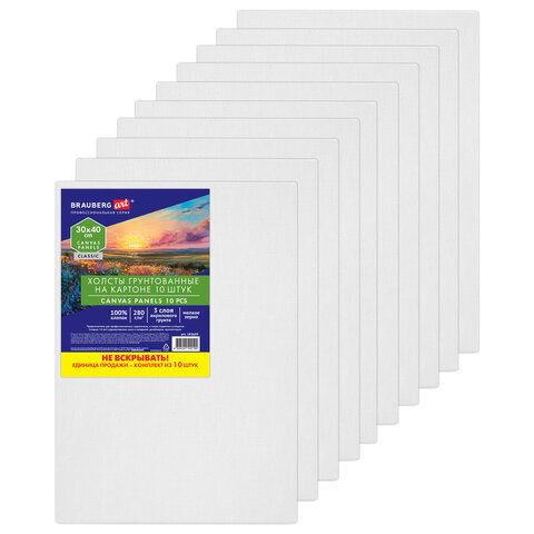 Холсты на картоне НАБОР 10 штук (30х40 см), хлопок, грунт, 280 г/м2, BRAUBERG ART CLASSIC, 192659