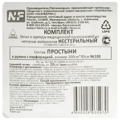 Простыня голубая рулонная с перфорацией 100 шт., 80х200 см, спанбонд 20 г/м2, NF