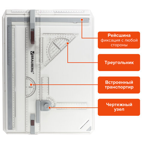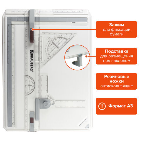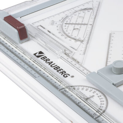 | Особенности | антискользящие резиновые ножки, встроенный транспортир, две измерительные шкалы, дополнительная шкала для установки развода циркуля, дополнительный зажим для фиксации угла листа бумаги, подставки для размещения доски под наклоном, с рейсшиной |