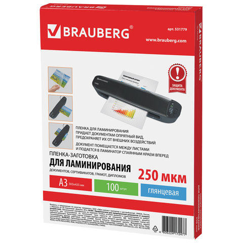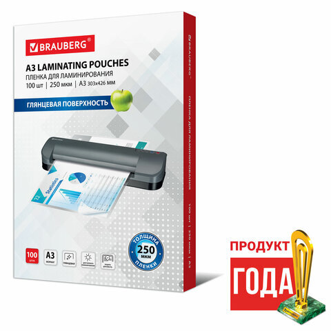 Пленки-заготовки для ламинирования БОЛЬШОГО ФОРМАТА, А3, КОМПЛЕКТ 100 шт., 250 мкм, BRAUBERG, 531779