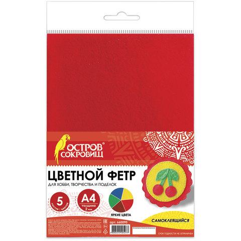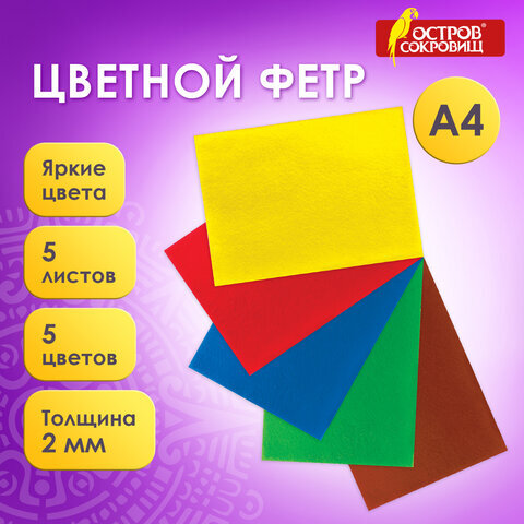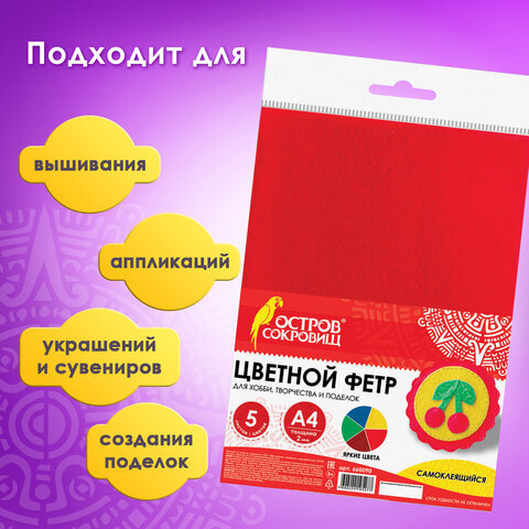 Цветной фетр МЯГКИЙ А4, 2 мм, 5 листов, 5 цветов, плотность 170 г/м2, самоклеящийся, ОСТРОВ СОКРОВИЩ, 660090