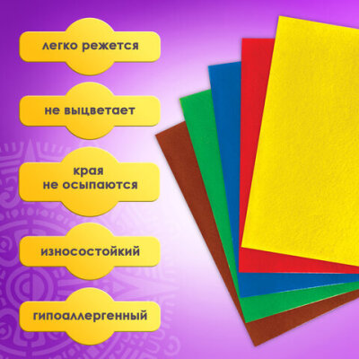 Цветной фетр ОСТРОВ СОКРОВИЩ предназначен для создания ярких творческих поделок дома, в школе и в детском саду. Используется для создания аппликаций и вышивания, легко режется и приклеивается на ровную поверхность.