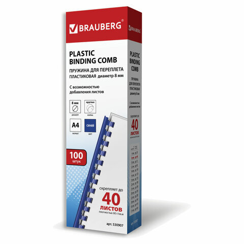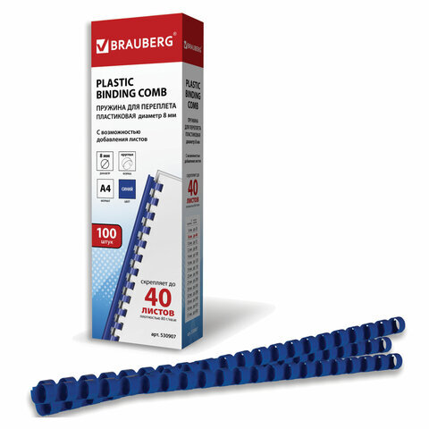 Пружины пластиковые для переплета, КОМПЛЕКТ 100 шт., 8 мм (для сшивания 21-40 л.), синие, BRAUBERG, 530907