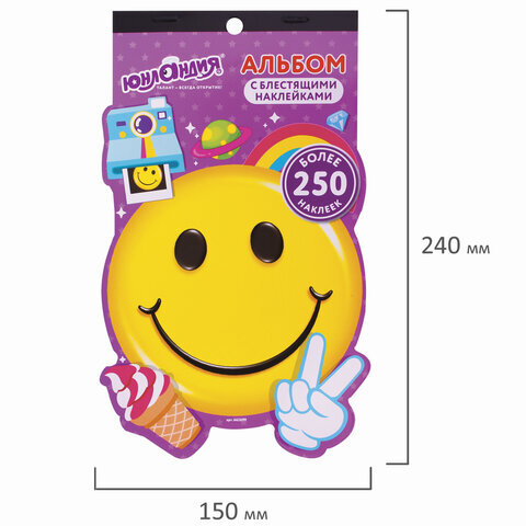 Альбом со сверкающими наклейками "Смайлики", 4 листа, более 250 шт., склейка, ЮНЛАНДИЯ, 662699
