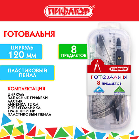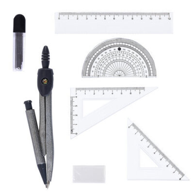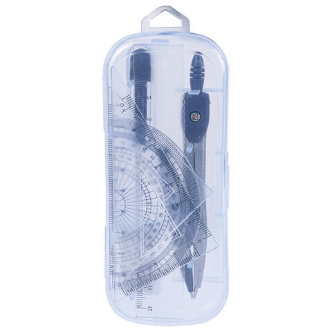 | Комплектация | линейка, пенал пластиковый, пенал с запасным грифелем, стирательная резинка, транспортир, треугольник 30°60°, треугольник 45°, циркуль |