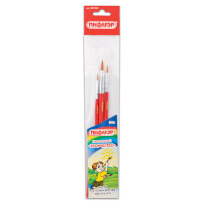 Кисти ПИФАГОР, набор 3 шт. (СИНТЕТИКА: круглые № 2, 3, 5), пакет с европодвесом, 200226