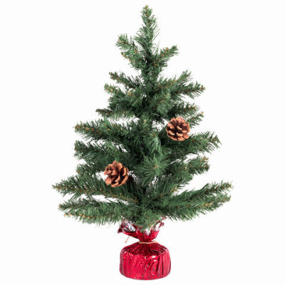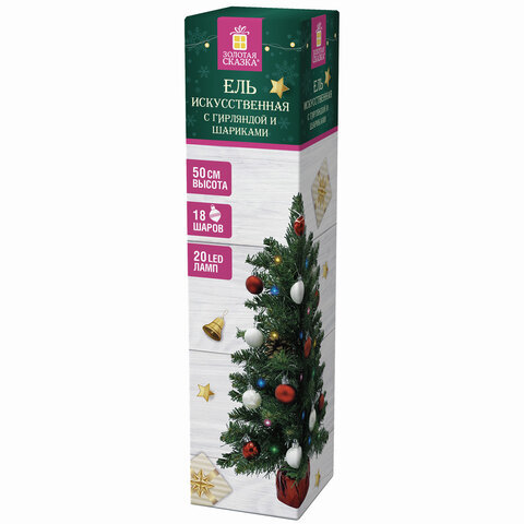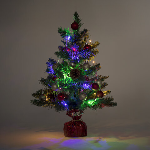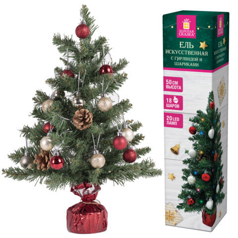 Ель искусственная декоративная, 50 см, зеленая, с гирляндой и игрушками, ЗОЛОТАЯ СКАЗКА, 591316
