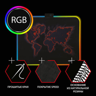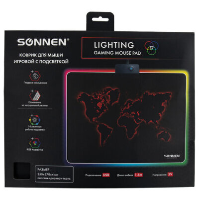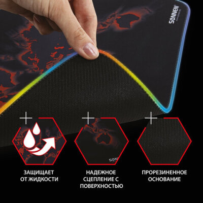Игровой коврик для мыши SONNEN "LIGHTING" с RGB подсветкой подходит для оптических и лазерных мышей с любой чувствительностью и любым типом сенсора и обладает устойчивым сцеплением с поверхностью стола.