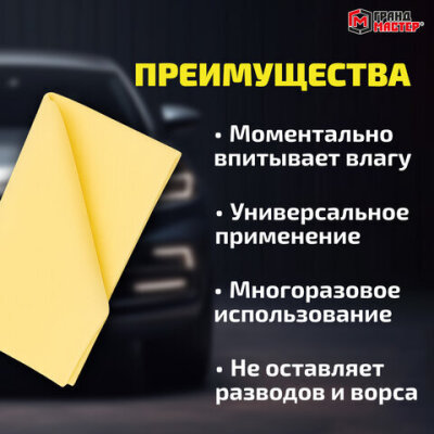 Инновационная салфетка из искусственной замши ГРАНДМАСТЕР – универсальное средство для ухода за автомобилем! Обладает сверхсильной впитываемостью, легко удаляет загрязнения без моющих средств и разводов, идеально подходит для сушки.
