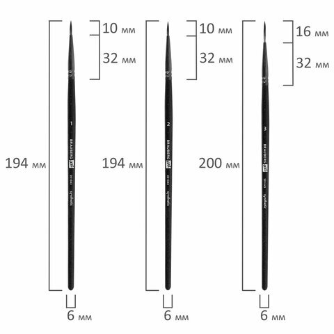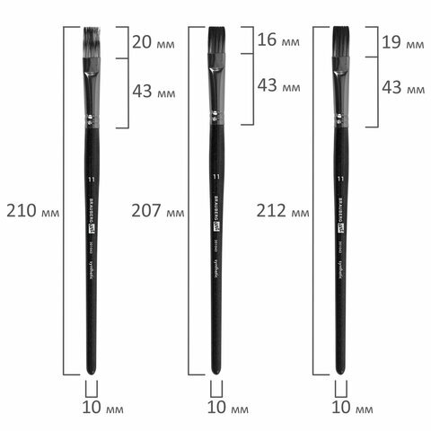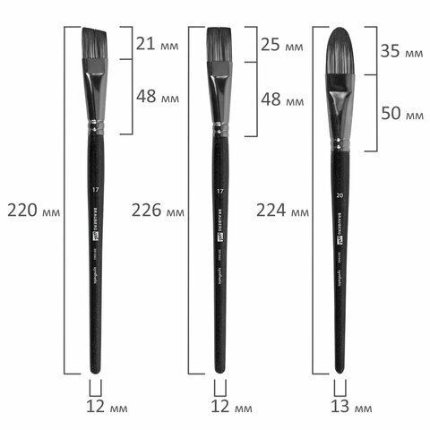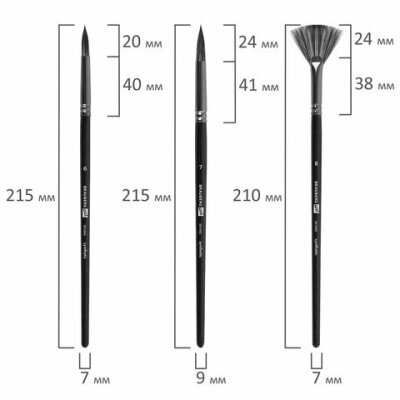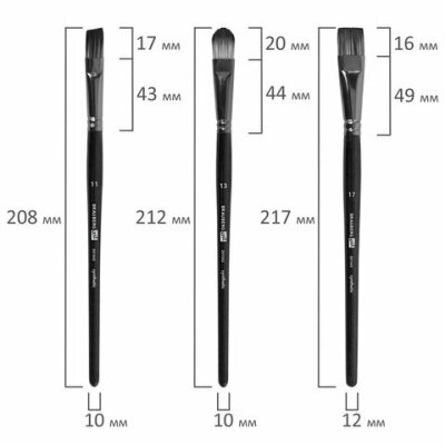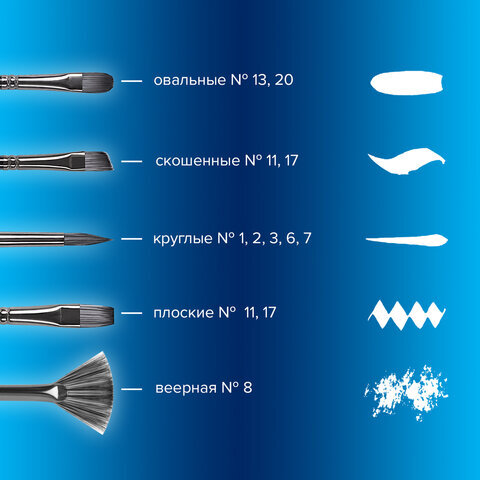 | Номер кисти | скошенные - № 11, № 17; плоские - № 11, № 17; веерная - № 8; круглые - № 1, № 2, № 3, № 6, № 7; овальные - № 13, № 20 |