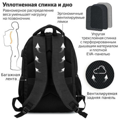 Рюкзак BRAUBERG URBAN универсальный с отделением для ноутбука, USB-порт, "Kinetic", черный, 46х31х18 см, 270798