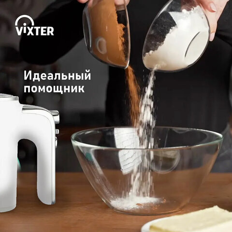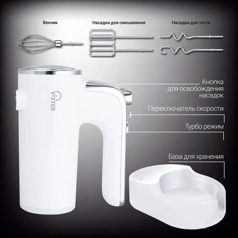 | Комплектация | венчики, крюки для теста, насадка для смешивания, подставка |