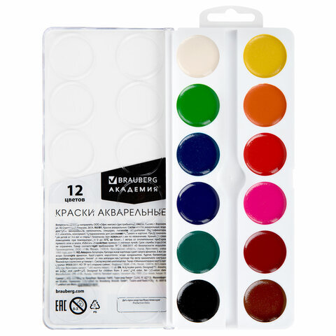 Краски акварельные BRAUBERG 12 цветов "АКАДЕМИЯ КЛАССИЧЕСКАЯ", медовые, круглые кюветы, 192554