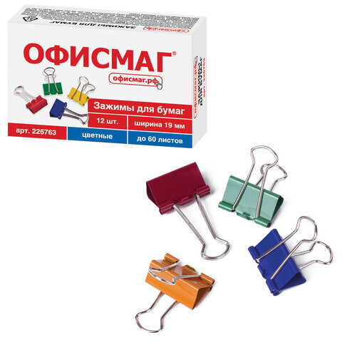 Зажимы для бумаг ОФИСМАГ, КОМПЛЕКТ 12 шт., 19 мм, на 60 листов, цветные, картонная коробка, 226763