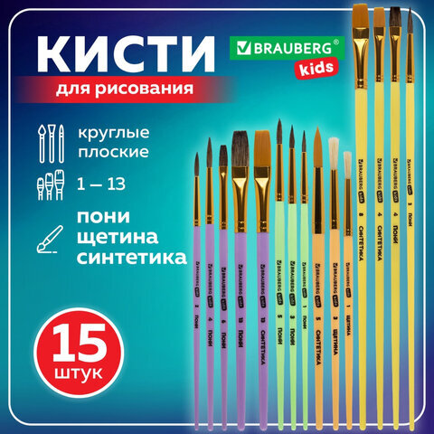 Кисти НАБОР 15 шт. (ПОНИ – 9 шт., СИНТЕТИКА – 4 шт., ЩЕТИНА – 2 шт.) BRAUBERG KIDS, 201081