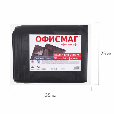 Мешки для мусора 240 л черные, в пачке 20 шт., ОСОБО ПРОЧНЫЕ, ПВД 60 мкм, 90х140 см, ОФИСМАГ, 609340