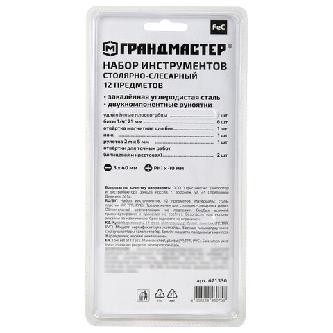 Набор инструментов столярно-слесарный, 12 предметов, блистер, ГРАНДМАСТЕР, 671330