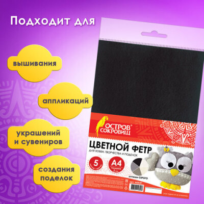 Цветной фетр МЯГКИЙ А4, 2 мм, 5 листов, 5 цветов, плотность 170 г/м2, оттенки серого, ОСТРОВ СОКРОВИЩ, 660647