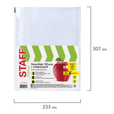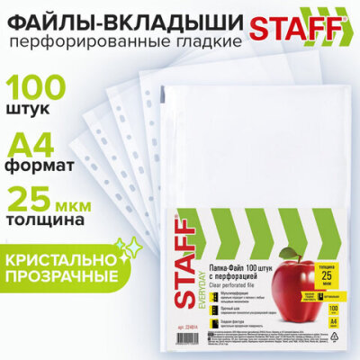 Папки-файлы перфорированные, А4, STAFF "STANDARD", КОМПЛЕКТ 100 шт., гладкие, 25 мкм, 224814