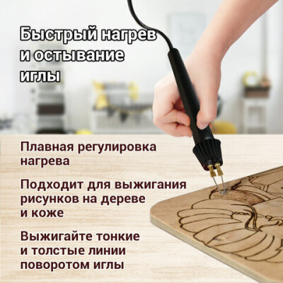 Предназначен для выжигания по дереву. Рекомендуется для детского творчества. Можно использовать как для домашних занятий, так и на уроках труда в школах и детских садах, в творческих мастерских, при обучении в кружках.