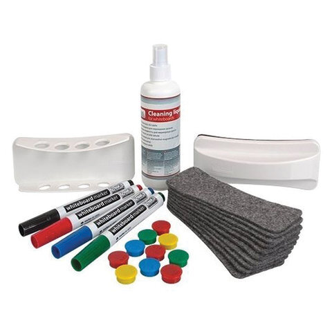 «АЛГОРИТМ»| Состав набора | войлочные салфетки для стирателя, магнитный держатель для маркеров, магниты, маркеры для доски, стиратель магнитный, флакон с чистящей жидкостью-спреем |
