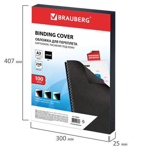 Обложки картонные для переплета БОЛЬШОЙ ФОРМАТ А3, КОМПЛЕКТ 100 шт., тиснение под кожу, 230 г/м2, черные, BRAUBERG, 530944