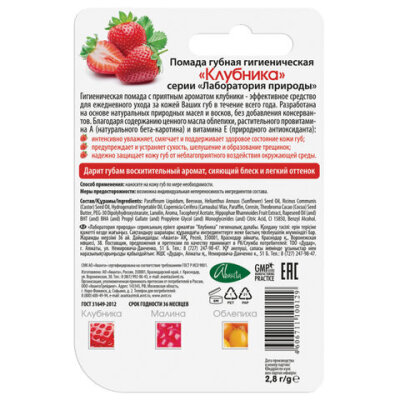 Гигиеническая помада ЛАБОРАТОРИЯ ПРИРОДЫ "Клубника" с приятным ароматом клубники предназначена для ежедневного мягкого ухода за губами.