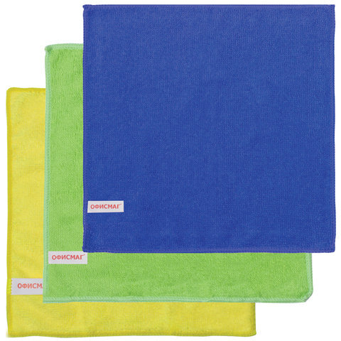 Салфетки из МИКРОФИБРЫ универсальные 25х25 см КОМПЛЕКТ 3 шт, ассорти (синяя, зеленая, желтая), 200 г/м2, ОФИСМАГ, 603864