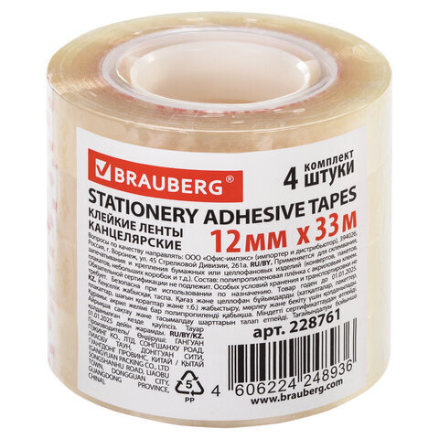 • Канцелярская клейкая лента BRAUBERG разработана специально для канцелярских нужд. Широко используется в бытовой, банковской и офисной сфере.