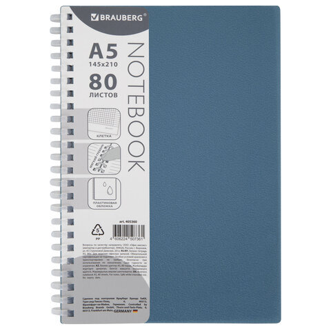 Тетрадь обложка пластик, А5 80 л., гребень мягкий (силиконовый), клетка, BRAUBERG, синий, 405360