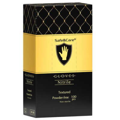 Перчатки SAFE&CARE общего назначения нитриловые, неопудренные, гипоаллергенные, нестерильные. Текстурированная поверхность на пальцах, цвет черный, форма плоская, манжета с валиком.