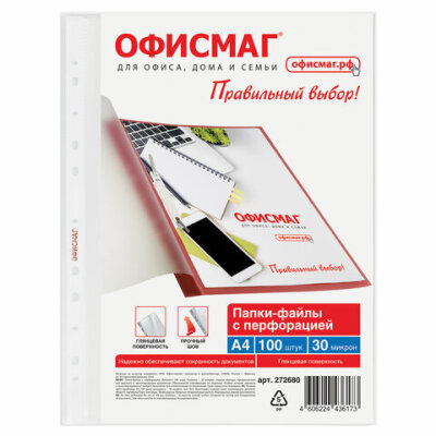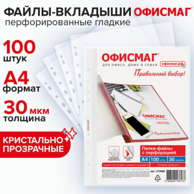 Папки-файлы перфорированные А4 ОФИСМАГ "Стандарт", КОМПЛЕКТ 100 шт., гладкие, 30 мкм, 272680