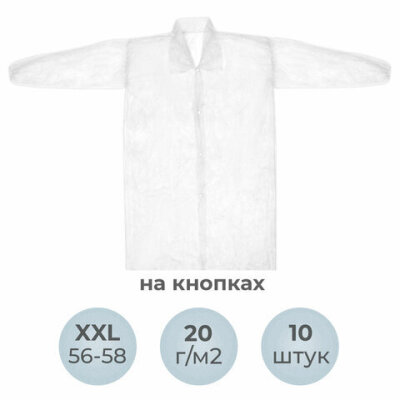 Халат одноразовый белый на кнопках КОМПЛЕКТ 10 шт., XXL, 56-58 размер, 110 см, рукав на резинке, 20 г/м2, СНАБЛАЙН