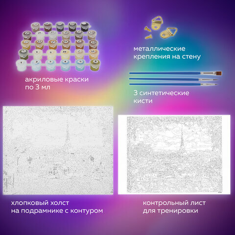 | Комплектация | акриловые краски, кисть, крепеж, лист бумаги для тренировки, холст на подрамнике |