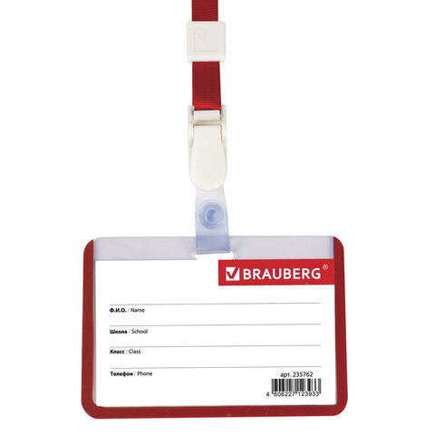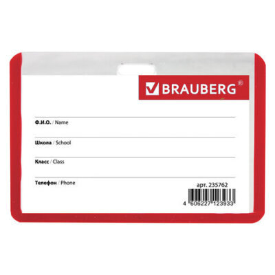 Горизонтальный бейдж школьника BRAUBERG с красной окантовкой используется для идентификации учащегося в образовательных учреждениях.