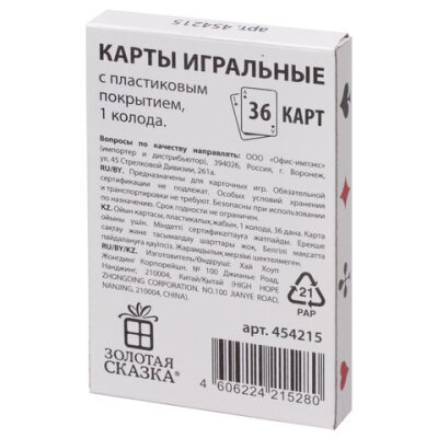 Карты игральные, 36 карт, с пластиковым покрытием, 454215