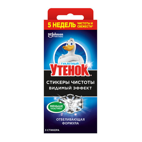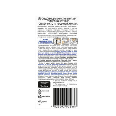 Стикеры чистоты "Видимый эффект" ТУАЛЕТНЫЙ УТЕНОК поддерживают чистоту и свежесть в туалете до 5 недель. Защищают от известкового налета, борются с очагами скопления микробов.