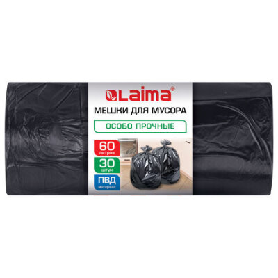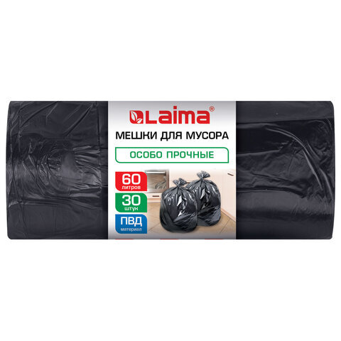 Мешки для мусора 60л черные в рулоне 30 штук особо прочные, ПВД 30 мкм, 58x68см, LAIMA, 702658