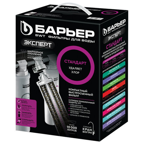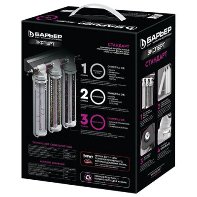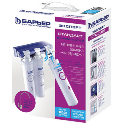 • Фильтр для воды БАРЬЕР "Эксперт Стандарт" обеспечивает комплексную очистку водопроводной воды от всех основных содержащихся в ней вредных примесей.