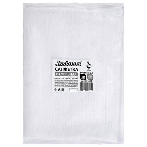 Салфетки ВАФЕЛЬНЫЕ отбеленные, 45х60 см, плотность 140(±10) г/м2, КОМПЛЕКТ 10 шт., ЛЮБАША, 606634