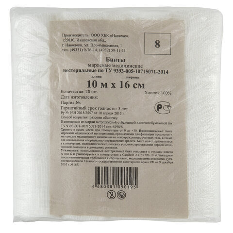 Бинт медицинский марлевый, нестерильный в групповой упаковке изготовлен из впитывающего материала - марли медицинской, плотностью 30 г/м2.