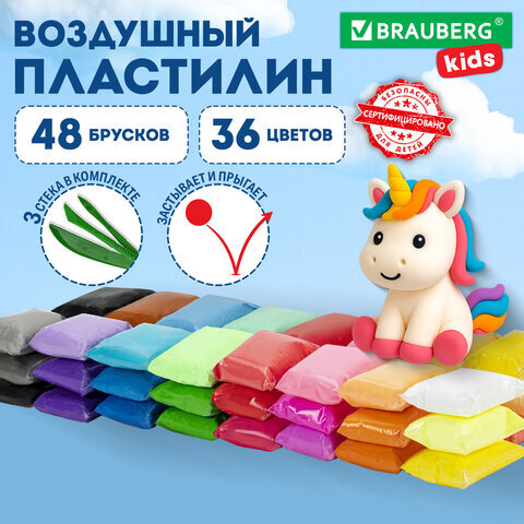 Пластилин супер лёгкий воздушный застывающий 48 шт. (36 цветов + 12 базовых), 480 г, 3 стека, BRAUBERG KIDS, 106310