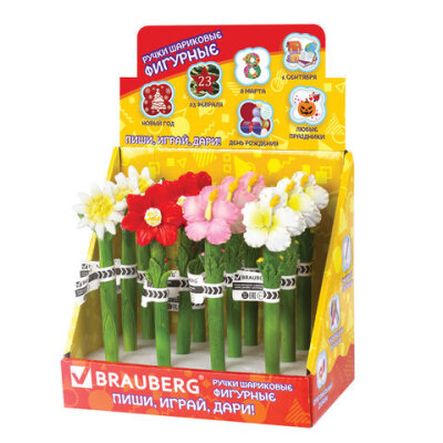 Ручка фигурная "ЦВЕТОЧКИ", СИНЯЯ, 4 дизайна ассорти, линия письма 0,5 мм, дисплей, BRAUBERG, 142775