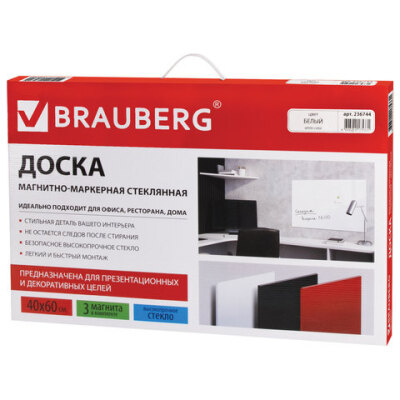 Доска магнитно-маркерная стеклянная 40х60 см, 3 магнита, БЕЛАЯ, BRAUBERG, 236744